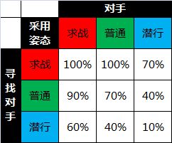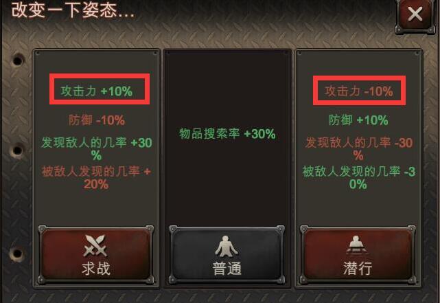 4)游戏后期,潜行姿态收益大于求战姿态,同样数据的两位角色单挑,用潜行姿态的角色会比用求战姿态的角色受到的伤害少5点左右。不过,由于潜行和求战间的单挑,双方发现概率都会很低,十分看脸……一般只有在自己劣势需要拼脸,或拥有白嫖套装或技能时才会采用潜行对抗求战。