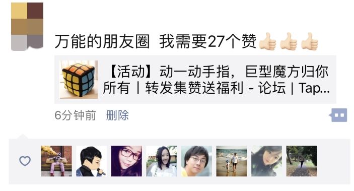只要在手机端点击右上角分享按钮,将本帖分享到微信朋友圈(如下图所示,注意需要公开,不能对xx可见哦!)分享成功之后,集齐27(爱妻)个赞并在本帖回复并附上截图(点赞的部分要显示人物头像),我们将会在活动结束之后送上巨型魔方福利!魔方福利!福利!重要的事情说三遍。