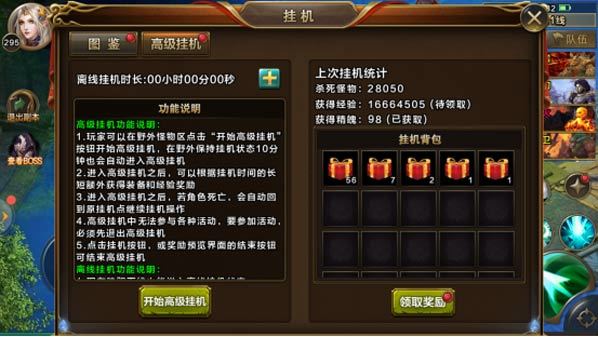 2.进入高级挂机之后,可以根据挂机时间的长短额外获得装备和经验奖励;