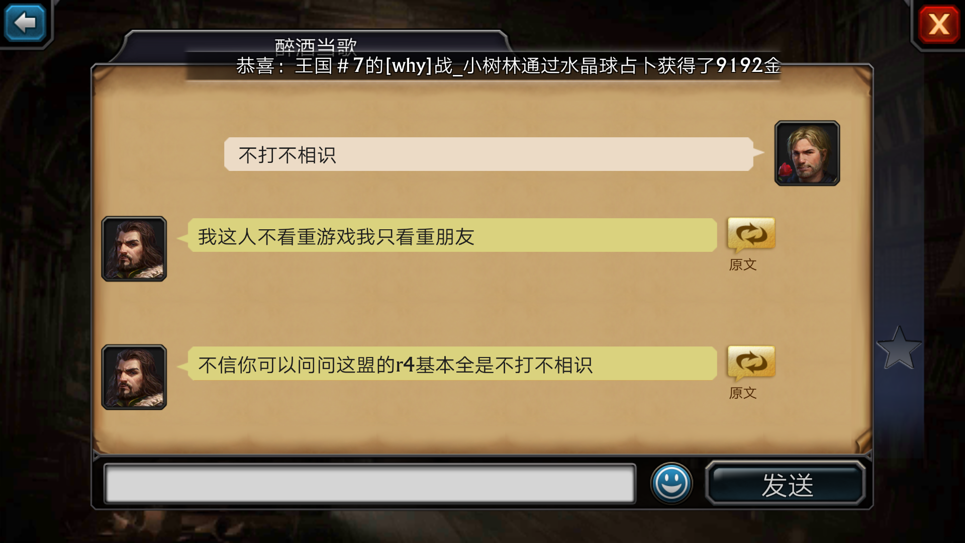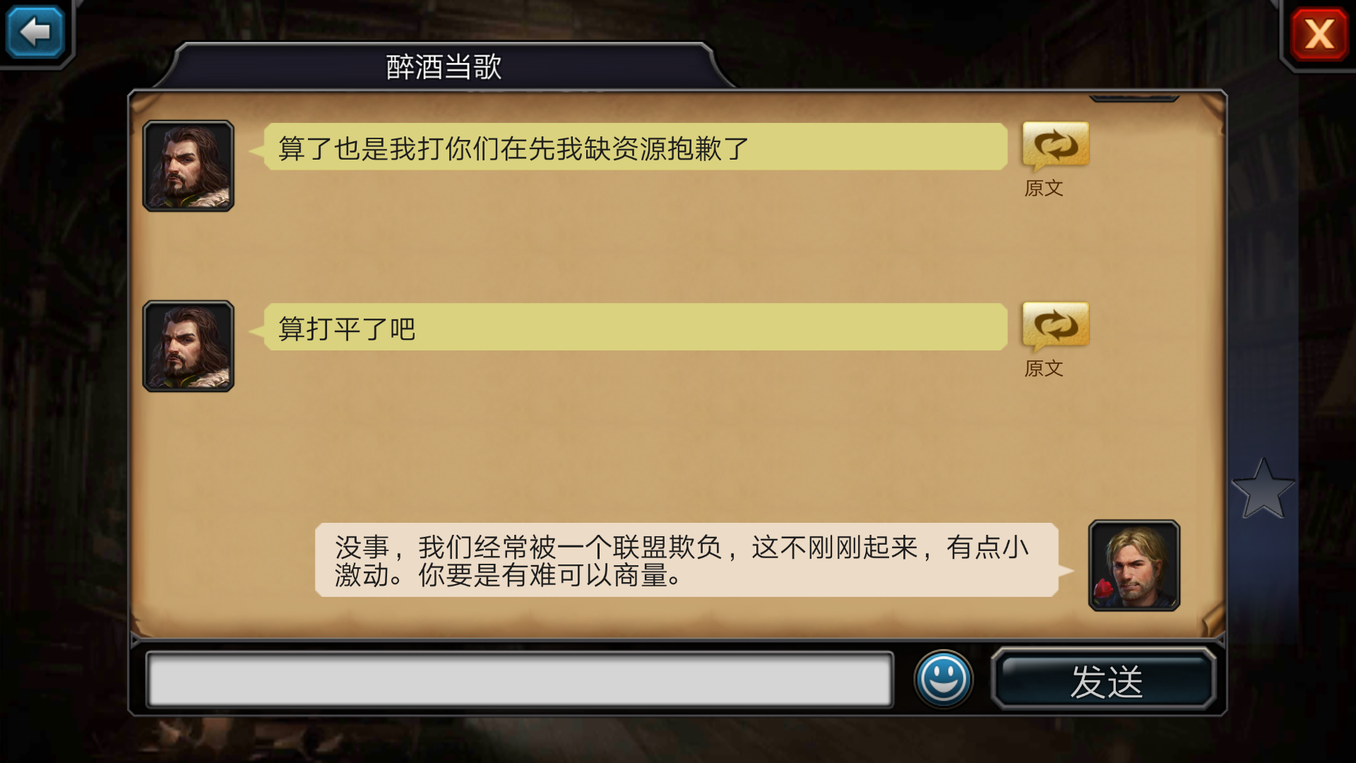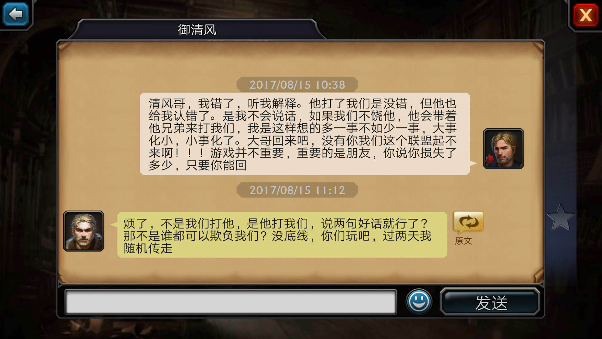 我游戏名叫破冰追风,刚玩这款游戏时什么都不会,一直在地图边界打资源,后来有一个玩家御清风一直在联盟里抱怨被欺负(当时这个联盟虽人多但要么是新手,要么被打的退服了),我给他聊了会感觉他人不错,就传送去找他,我到哪儿一直被欺负,后来我们商量好后我们自己建立一个联盟,当时就四个人跟我,一个五人小联盟,后来我们一直发展,3天后,我们等级都是10级左右,可是有一个13级城市叫醉酒当歌的人攻打了我们的成员和御清风,我和其他成员打了过去,醉酒当歌传送走了,声称要叫人来,我说我等着,后来我们聊了起来,他最后承认了错误,于是我就成了朋友,并说可也友盟帮助我们。我在公屏里发出了消息,可是御清风他心里过不去,退盟了。现在我联盟里的新手说我怂瞧不起我。我有错吗? 我该怎么办啊? 求各位指点。