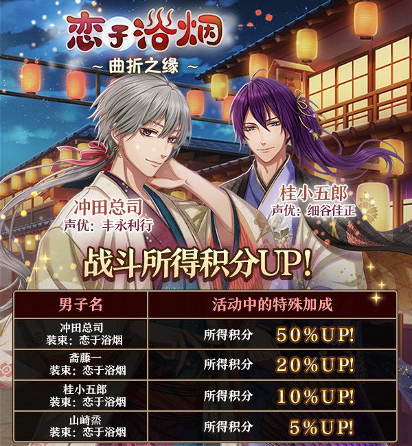 ※<恋于浴烟>活动结束后,【装束:恋于浴烟】的冲田总司、斋藤一、山崎烝,桂小五郎活动积分加成UP效果消失。