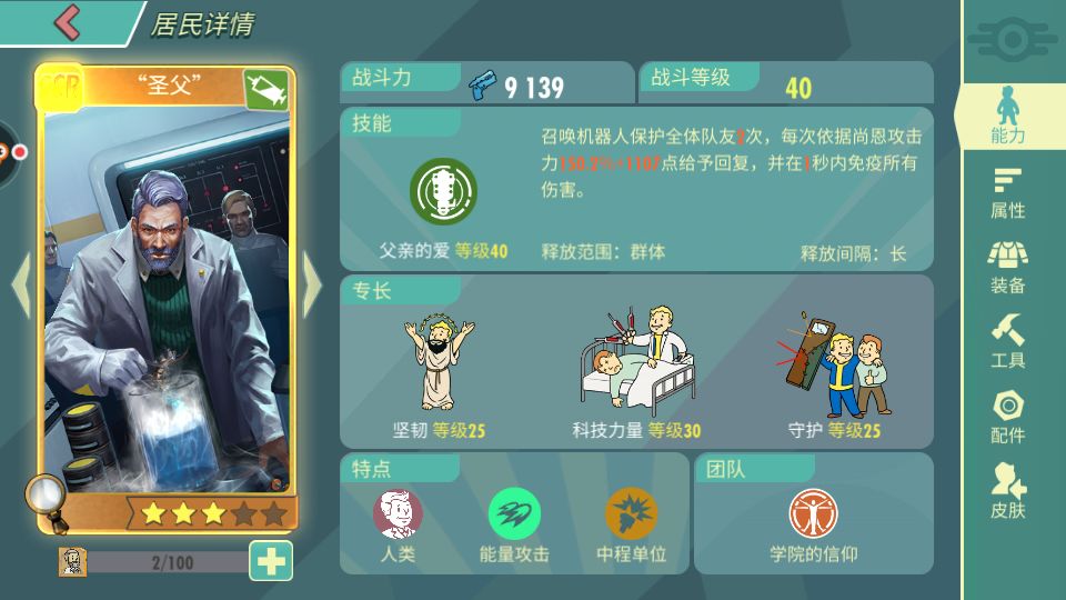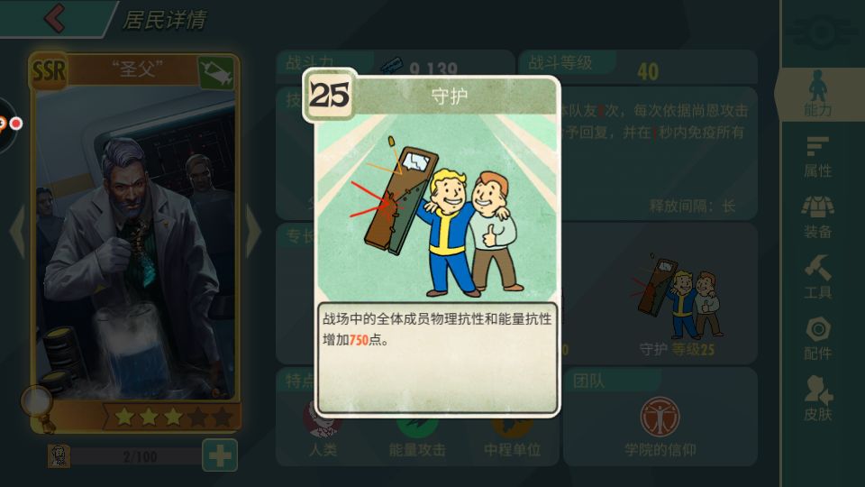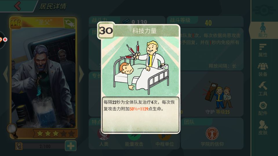 来看看大招属性:“圣父”召唤机器人保护全体队友两次(这个机器人应该就是“我”孙子了),每次依据尚恩攻击力的150%左右加上技能等级的不定量回复生命值,并附带一个全体在1s免疫所有伤害的护盾。可以说是非常恐怖了。而且两次治疗都附带一次护盾效果,我觉得虽说奶量不怎么好,但是用来卡boss的技能效果很好。