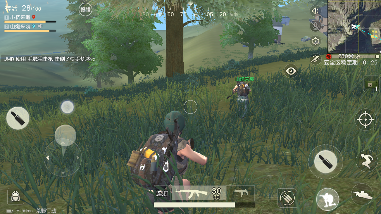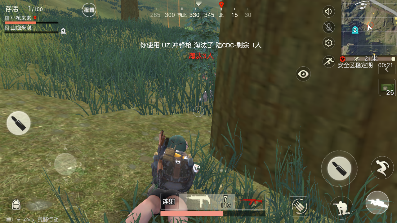 队友又打开海绵宝宝了,我紧张起来还有2个人要打,嘿哟,一个人在我旁边蹲着,我AK扫过去,又是一个人头,嘿哟旁边还有一个,一队的,一看就知道他没子弹了,我和他饶着树,我对他开着枪,最后,终于