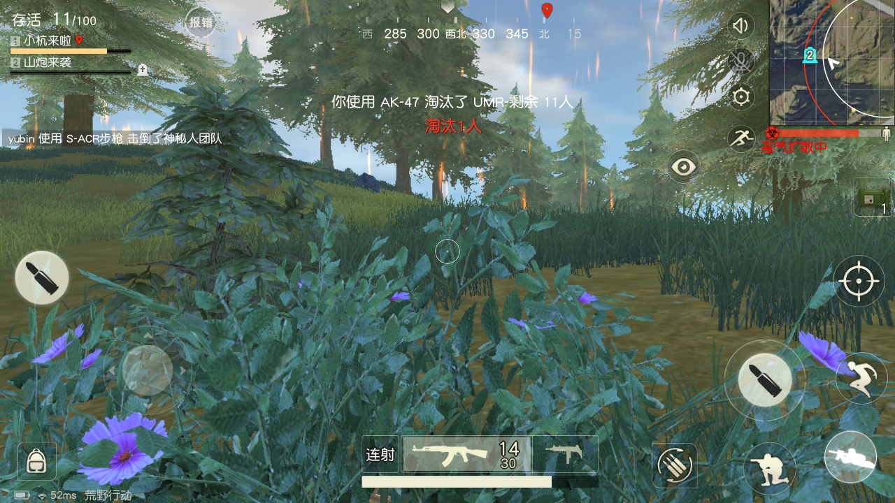 我们爬到安全区后,队友被别人用狙击打死了,他关掉了电视,全程靠我的感觉,然后我爬过去,突然前面一个人过来,我拿起AK就是一顿乱扫,帮队友报了仇