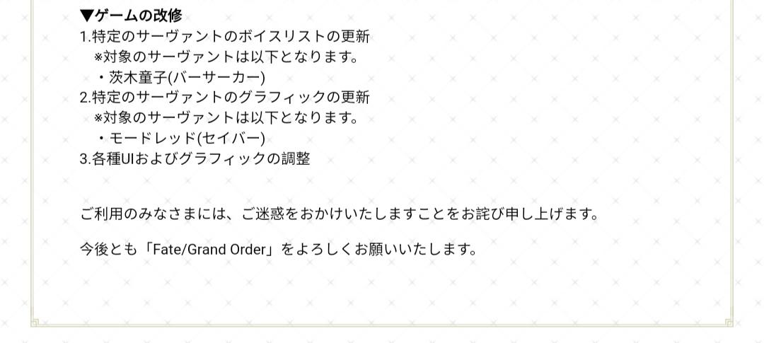 日服更新相关:茨木童子语音追加,莫德雷德图像更新.