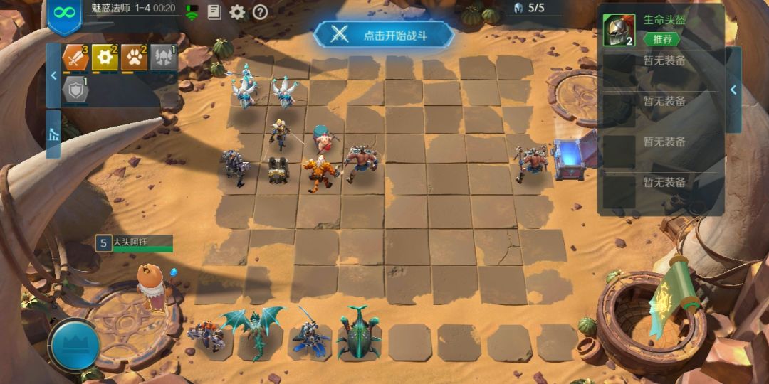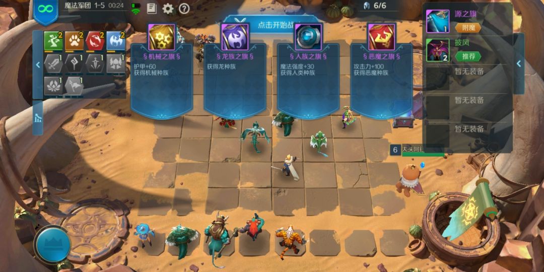 1-5 备战区选一名人类羁绊的棋子上场,旗帜选人族之眼,两个披风全装到灵枭师祖身上,合成后的装备选第三个 (旗帜我选龙族也过了)