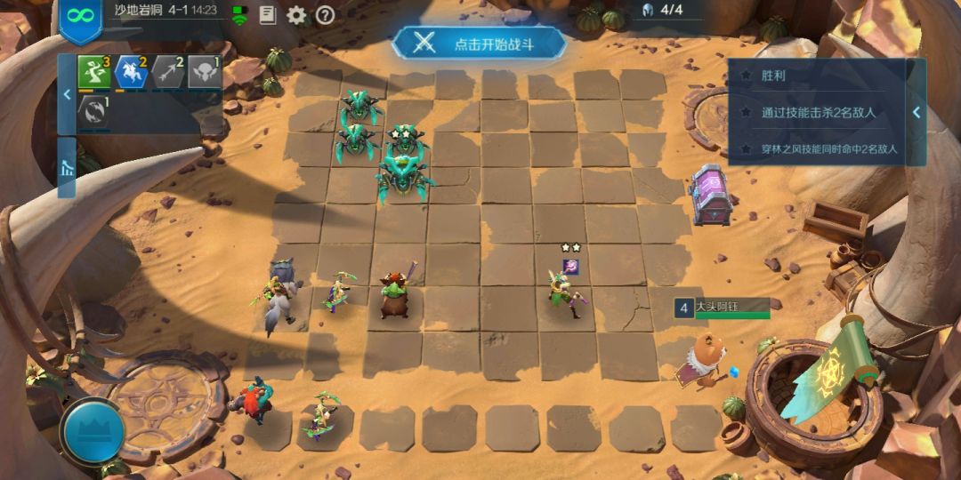 4-1 这关的随机性太高了,独角仙的移动方式实在让人看不懂(阵容如上图)你要首先杀掉一只单独出来的独角仙,并且在另外三只独角仙蓝条满之前,让穿林之风成功释放技能 (这套方案目前只有这个成功过)