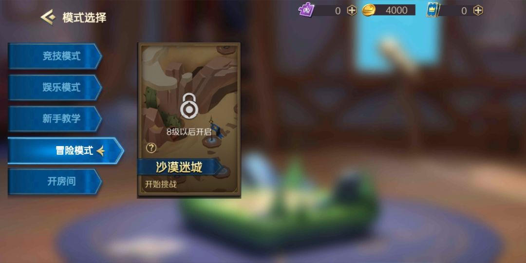 冒险模式在八级以后开启(这是小号还没到八级),建议大家在八级之后把冒险模式通关,冒险模式的奖励可以让我们来购买自定义英雄(自定义这个设定我好服)