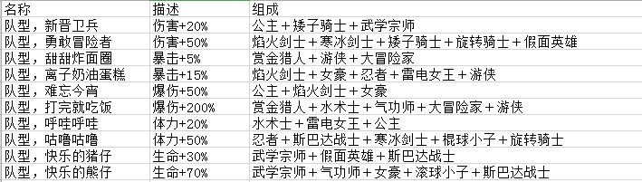 当勇者队伍中出现了指定的角色搭配,则全队将获得额外效果。