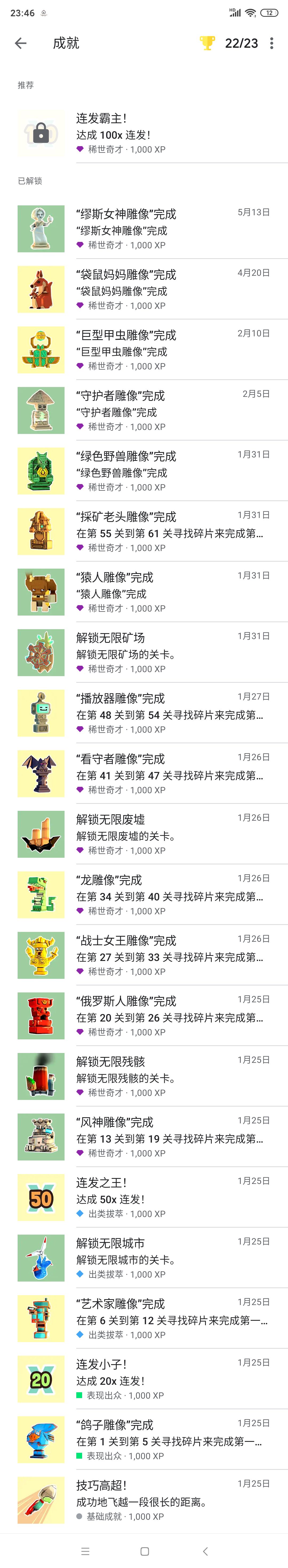 游戏谷歌商店可以下,成就差一个,一百连太难了,停顿时间很短,而且后面还有龙卷风,难度过大,懒得挑战。第6关可以无脑刷连击,不过我最多才六十多连,想刷金币也可以刷这一关。
