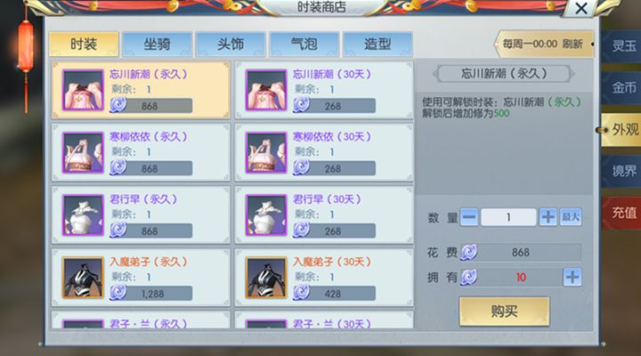 还没有拥有这一件时装的青曜十三司也不用着急,这件时装在时装商店就能够获取,玩家可以选择花费268灵玉购买30天期限的忘川新潮,也可以花费868灵玉购买永久期限的忘川新潮,这里肯定建议购买永久版的忘川新潮了,因为这一件时装值得青曜十三司玩家一直收藏。