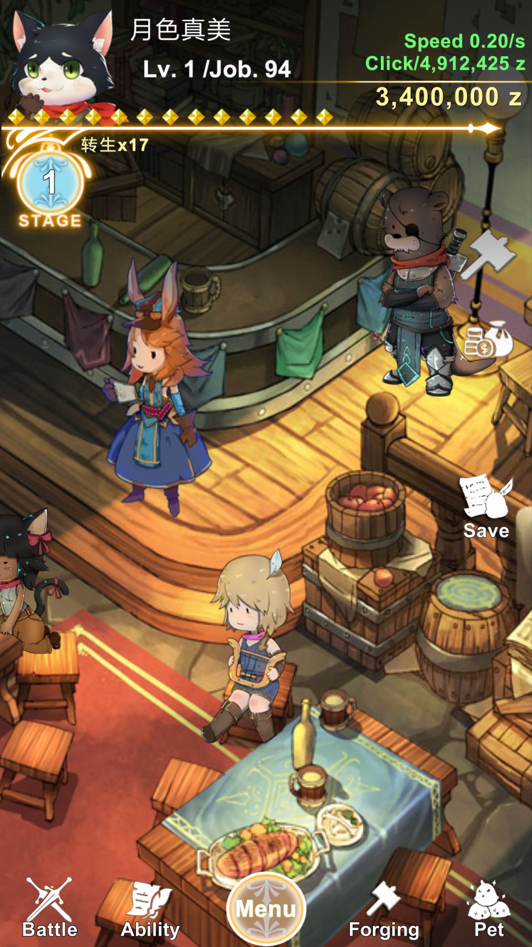 ⑤转生一定要在买了猫咪之后,然后你会发现游戏难度降了无数倍,因为猫咪5倍是可以和料理相乘的,然后变成了20倍速度,而点金升级的金钱是不变的