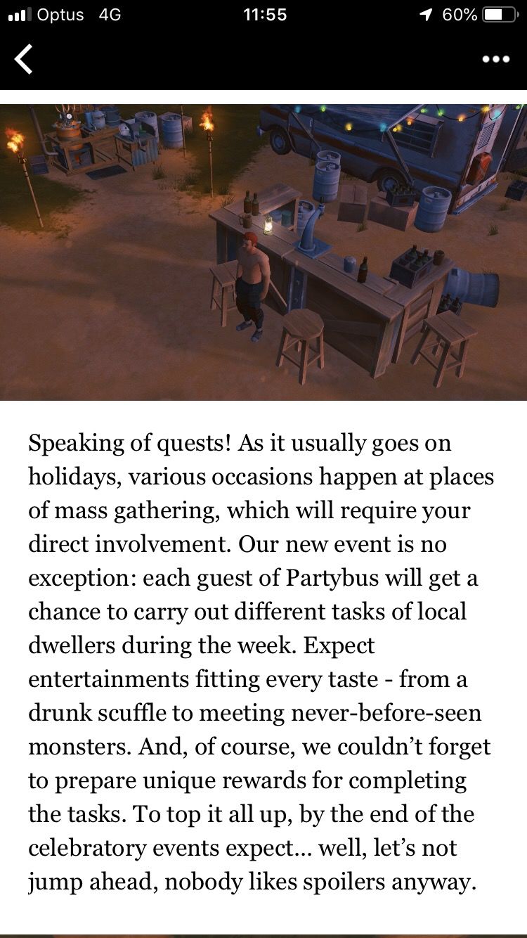 活动的重点自然是两周年纪念日,更新的主体也是围绕着这次的庆祝。所以,我们特别为此新增了一个叫做“派对巴士”的地点作为派对场地,准备好和那些超棒的老角色见面吧,他们也会到场喝个不醉不归!另外,没有酒的派对叫什么派对,用特殊的工作台来生产酒吧!你可以看着你的朋友喝酒,可以把酒给当地居民来完成任务,也可以自己喝---但我们警告你,后果将是无法预测的!