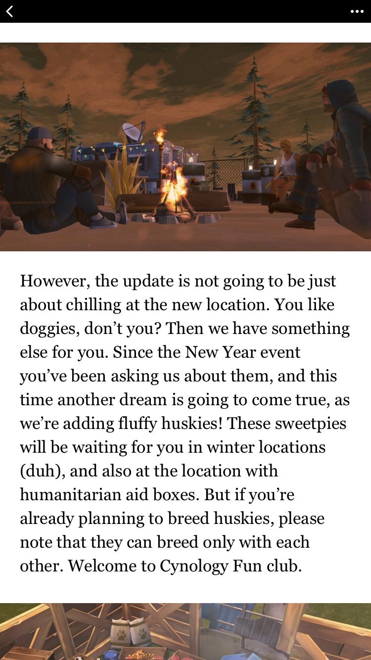 然而,更新也不仅仅是为了庆祝活动,你喜欢小狗狗不是吗?所以我们还为你们准备了别的东西,你们这些人从年初就开始要求这个,现在是时候让梦想成真了,我们新加入了毛茸茸的哈士奇!这些小可爱会在雪地地点等你们(唉),也会出现在人道主义救援箱,但如果你们打算繁殖哈士奇,希望你们记住哈士奇只能和哈士奇生宝宝,欢迎来到狗狗派对!