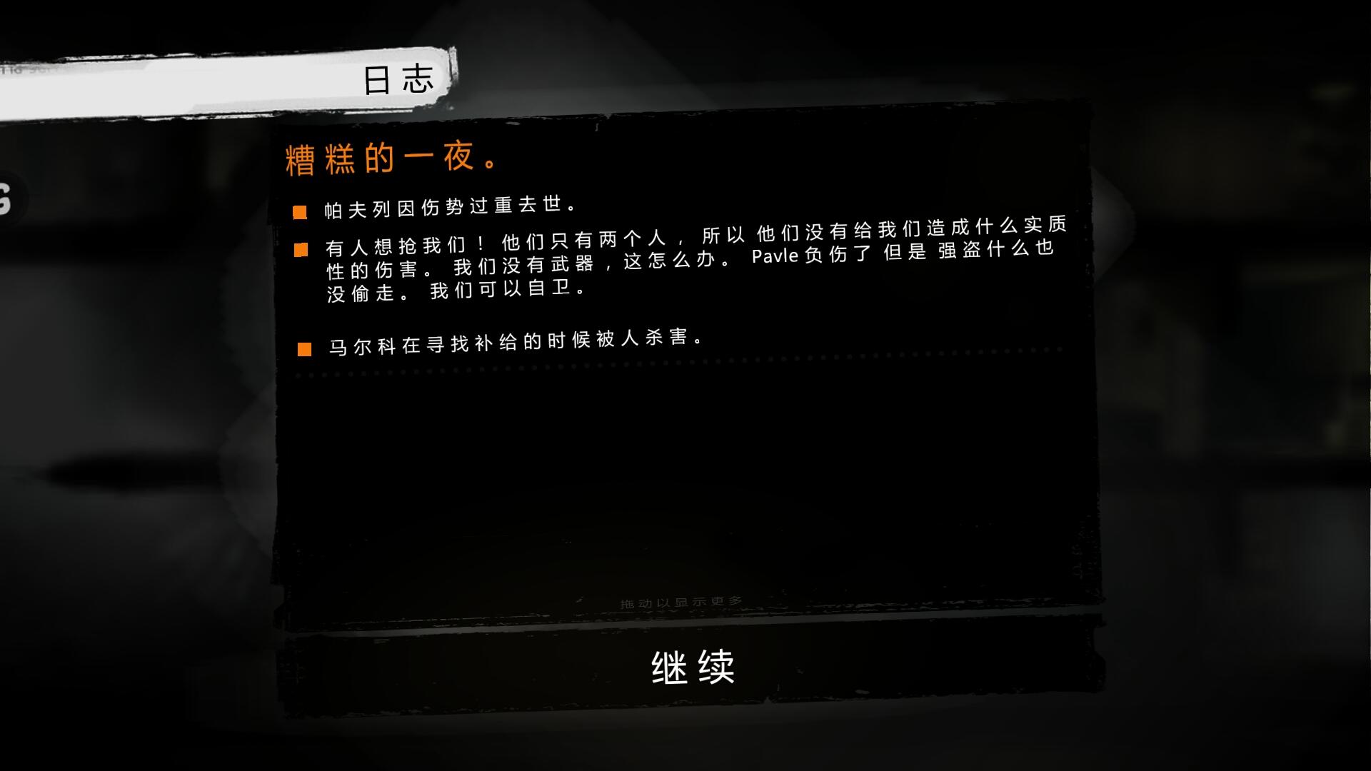 这个游戏非常人性化。因为拿了车库那对父子的食物,之后就一直沮丧。开始夫列去拿(偷)东西被他打成重伤,又一直沮丧。所以我又想派马尔科去把东西放回去,结果一开门就被他打死了(尴尬😓)。就剩下厨师一个人……