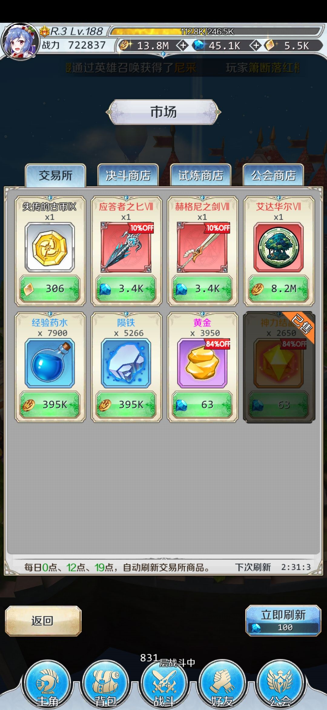 主角穿戴:攻击=穿透>物理防御>暴击,这里再加一点忘记说了,主城的宝石也很重要,每天10次一般我会刷7个以上的宝石袋子任务,陨铁不够就市场买(注意不要买资源里的陨铁太亏了)每天的免费刷新和自动刷新很容易出,如果不出就等明天就好了。