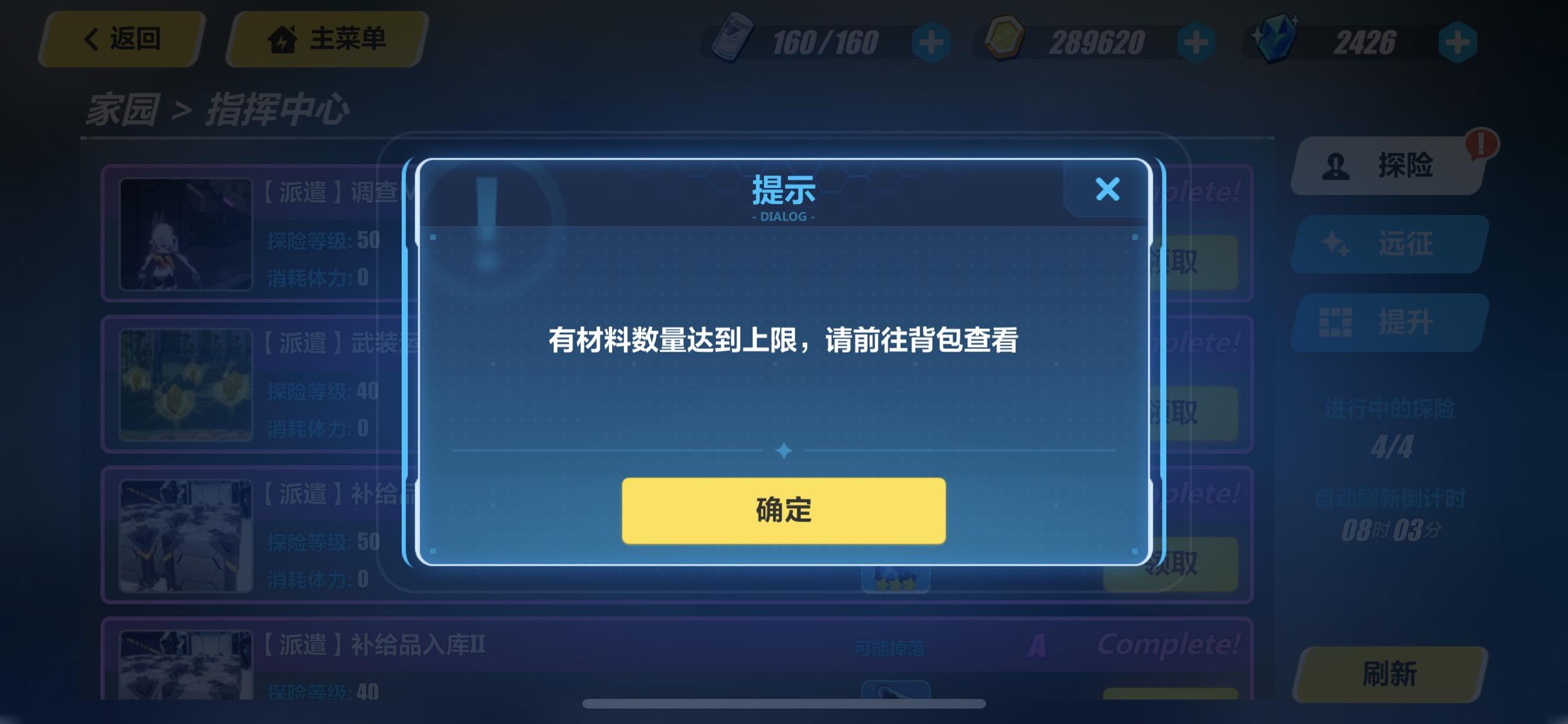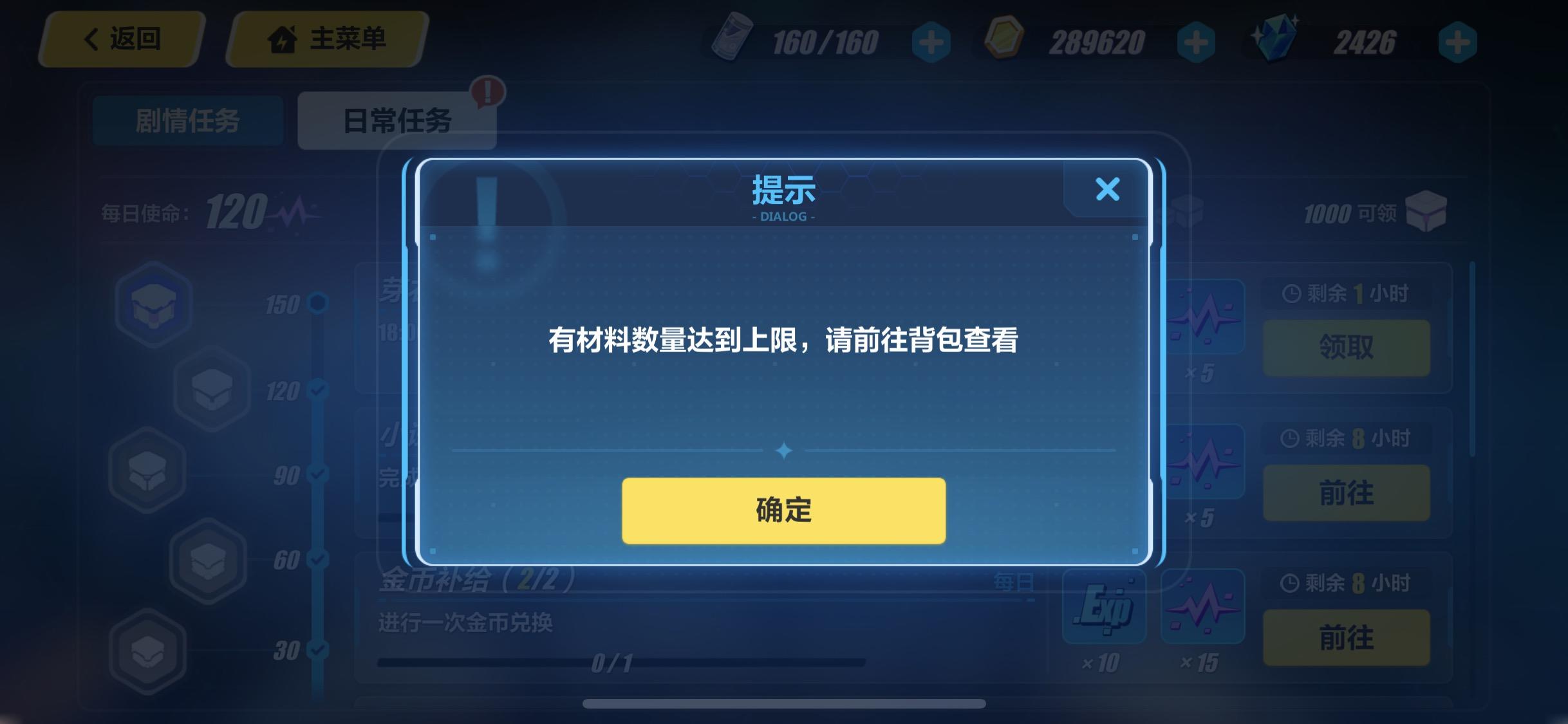在“日常任务”中领取日常任务,显示“有材料数量到达上限...”,进入游戏关卡,也是显示有材料到达上限,在背包中点击使用“吼姆宝藏”也显示“有材料数量到达上限”,我的金币一共才“282427”;打开“三原积木”点击“前往商店”,也是显示“有材料数量到达上限”,而且领取日常任务奖励的是“经验”和“使命”,跟背包里的材料有什么关系呢?