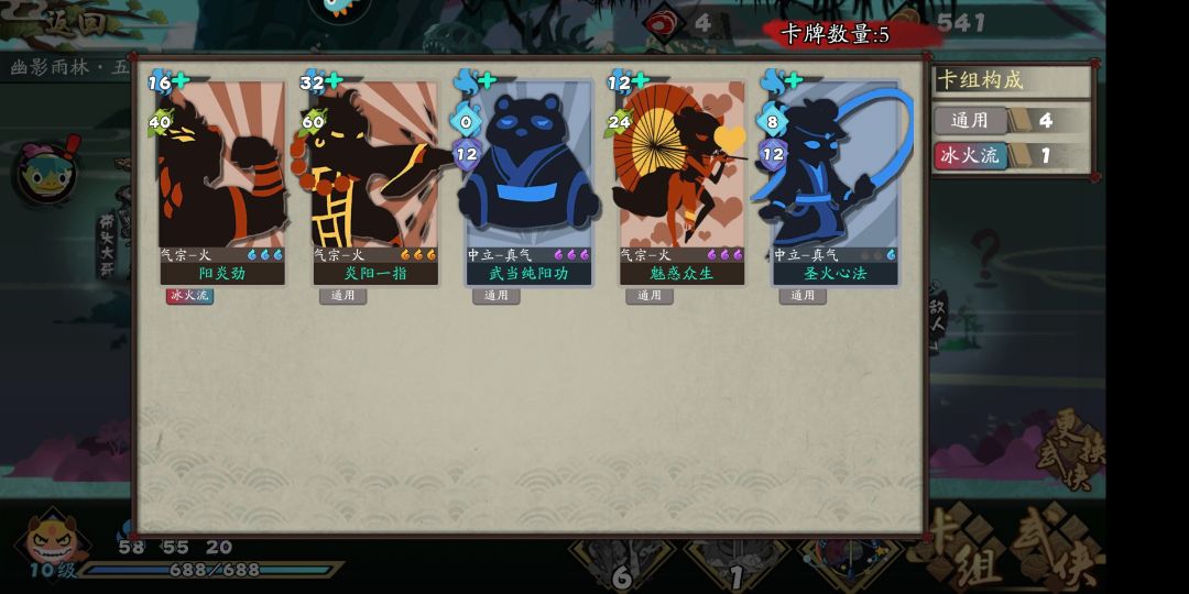 神器选择:带屠龙刀(删卡主力 这个阵容只需要武侠自带卡)落日弓(替换卡增加攻击力 聊胜于无 也可以换成倚天剑 不过因为都是武侠自带卡并且是小卡组山洞就能满足卡组升级需求 所以推荐落日弓)星弧(保证能够选到自己需要的属性 核心)