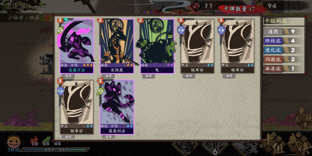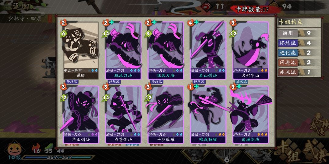 开局左右使田伯光神器选取弓令加扇子或者铁剑卡牌升级肯定要先给到逍遥剑法,升级后给全手牌上乱舞,然后狂风刀法要给到升级,核心思路就是保持手牌流畅性,为此还抓了三生绕指柔和泰山剑法卡牌方面高伤害靠逍遥刀法和落英剑法我抓的大多数是连击牌,所以拿上一张力劈华山,这张牌即可帮助启动连击,也可和点仓剑法配合选取高级卡牌点比较容易出唯我,进图前注意锁一下魂牵梦绕这种牌然后我选择了乌龟长颈鹿,不得不说长颈鹿这牌在历练表现极好,后期我甚至讲老田换成黄蓉了牺牲了一张狂风剑法换来更多的冷血次数套装的选取方面,因为之前听说难度较大,我就选取最怂最保命的。。。清风加千变(这也是后面一路我基本无伤砍怪平推的原因之一)然后是经典的四相夺魂(本来是清虚四相,但祭坛抓到开局多给卡,就换了)主要思路还是开局找长颈鹿,找逍遥剑法给卡牌上buff,然后狂风等卡牌过牌后触发冷血打出逍遥刀法和落英剑法