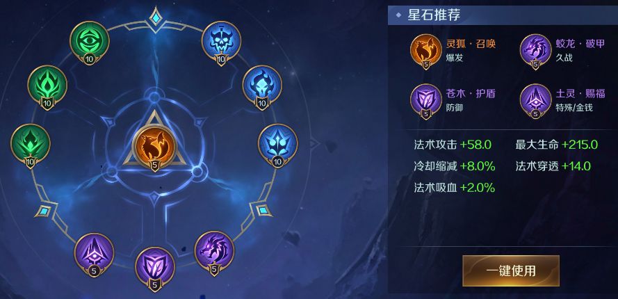 蓝绿星石首选冷却缩减和法术攻击来配合铁扇公主的技能伤害和续航。紫色星石推荐蛟龙,苍木,土灵,保证对线时更好的消耗和生存能力的同时,提供更快的发育速度。橙色星石选择灵狐,提升技能伤害。