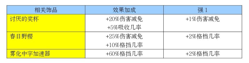 一些叠伤害减免的饰品,如“讨厌的奖杯”,在触发吸收上恰好能够弥补不足,可以用所吸收的伤害来扺消所受到的有伤害加成部分的伤害。