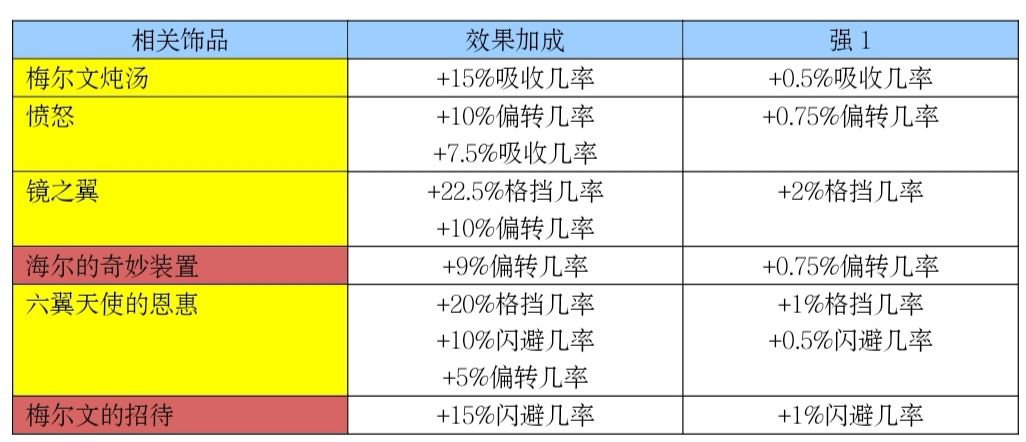 叠吸收几率首选炖汤,炖汤是这方面最突出的饰品;镜之翼比愤怒在触发偏转之前有更强的生存能力,但愤怒的吸收几率有较强的爆发力,且愤怒在叠偏转方面有更大的提升空间,海尔的奇妙装置可谓逆袭了金饰品,是第二好的叠偏转几率的饰品,但是没有一定的生存能力;六翼属于全能型防御饰品,但是特点不突出,梅尔文的招待是又一个逆袭的饰品,叠闪避几率首选梅尔文的招待。