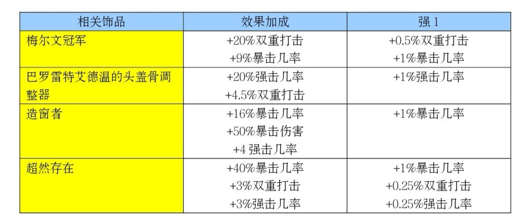 所给饰品附加的双重打击,强击,暴击都是低倍数的稳定型伤害。叠强击几率比叠双重打击有更大的提升空间,且两者都比较难叠。叠暴击几率的难度最小,但是没有提升空间,需要叠伤害加成的坐骑、符文、附魔和套装来弥补不足。