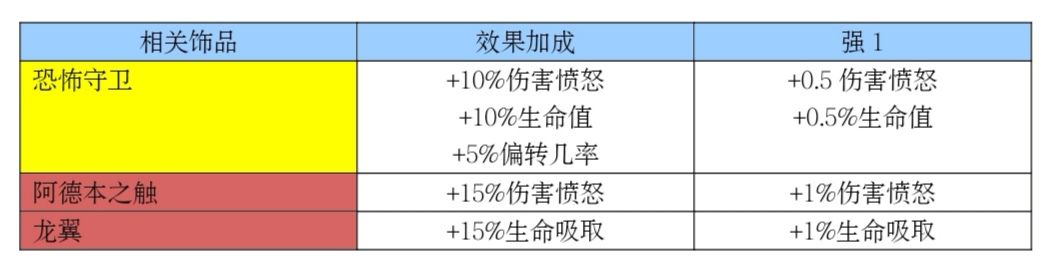 恐怖守卫相对于阿德本之触来说,有生命值的加成可提高愤怒值的上限,且偏转几率带来了一定的爆发能力,而阿德本之触虽有较高的伤害愤怒加成,但没有一定的生存能力,且较易达到愤怒值的上限;目前暂未推出有生命吸取加成的金饰品,龙翼便成了最好的叠生命吸取的饰品。