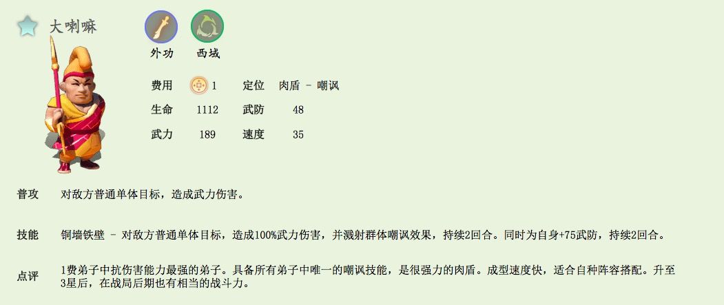 大家好!今日我们开讲《武侠Q传自走棋》中的外功弟子。这里要给大家一个小提示,在查看每个弟子的攻略图时,要多关注一下其中的点评栏目,它包含了官方给大家使用该弟子时的建议,有助于大家在棋局对战中搭配出最佳阵容。好了,还是闲话少说,直接上图。