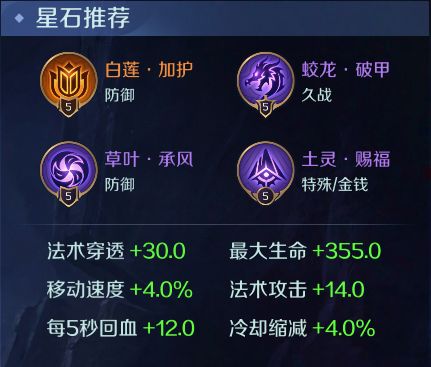 蓝绿星石首选生命值来确保自身的生存能力,冷却速度和移动速度可以提供更高的技能命中率和技能频率。紫色星石推荐蛟龙,草叶,土灵,保证和自身在团战中的持续作战能力的同时,也兼顾了更快的发育速度。