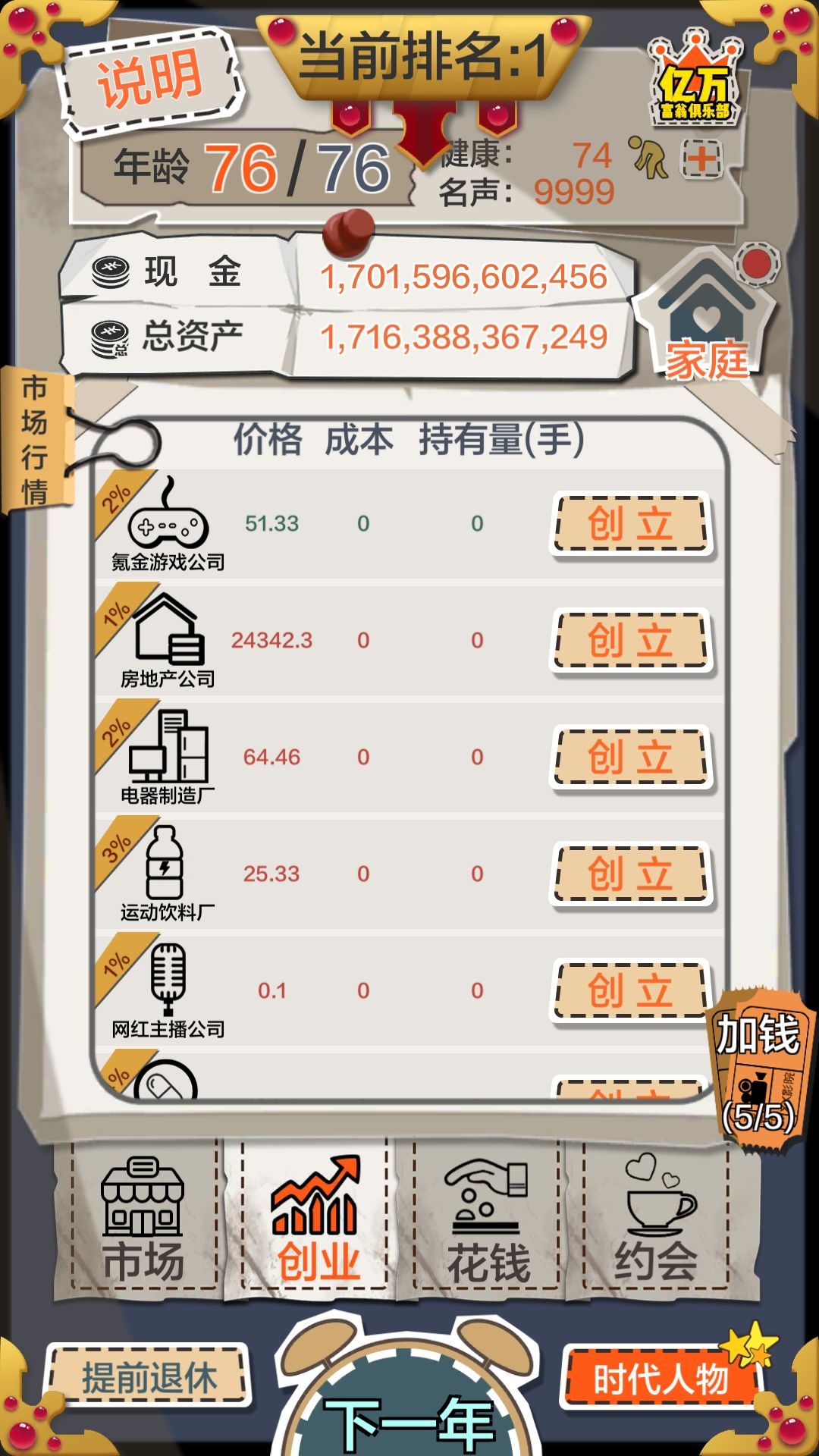 5.最后每年捣鼓股票,电影。轻松破百,破千亿,最后的总资产的多少取决于你什么时候捣鼓球队,楼主这一局是在50岁拿到的球队(总资产100亿+),最后用26年翻到了万亿。