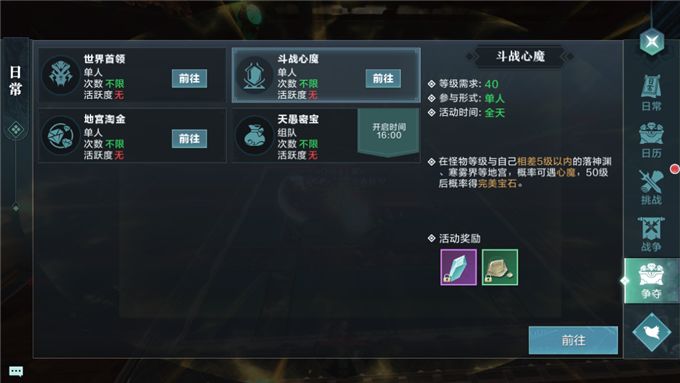 斗战心魔玩法全天开放,玩家不必刻意追求,可以和血刃悬赏、地宫淘金等玩法一起做。心魔被击杀后,掉落物品完全随机,但运气足够好的话,还是会有珍贵道具可以获得。
