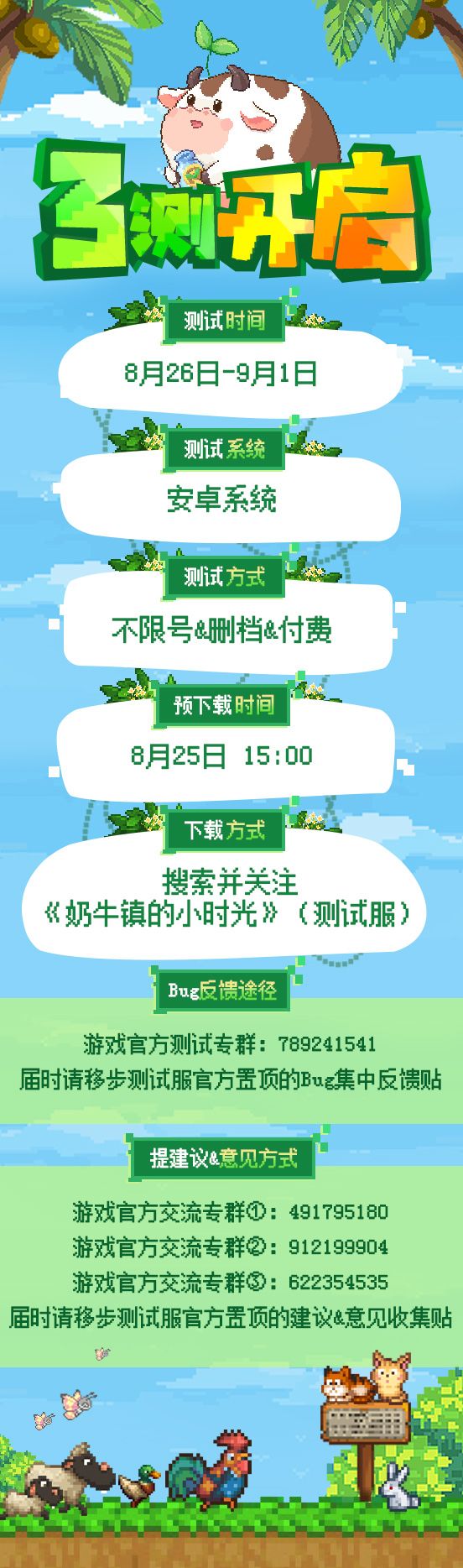 各位奶牛镇的居民小伙伴们,大家好!今天依然是万众瞩目的球球,要带来各位都期待已久的消息啦~!(❁´◡`❁)*✲゚*那就是我们终于要开启三测啦!!!可喜可贺~(掬一把辛酸泪.jpg)