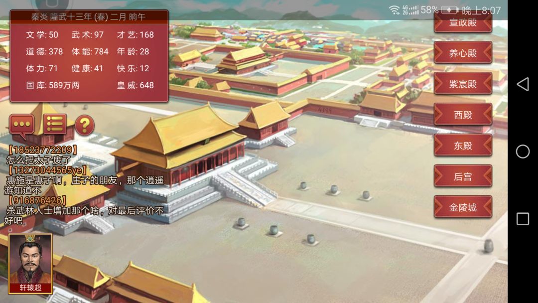 五个属性我就不一个一个说了,说重要的,体能很重要,它能增加你的体力上限,在后面教导皇子的时候没体能,你也教不动,反而会带来反作用。