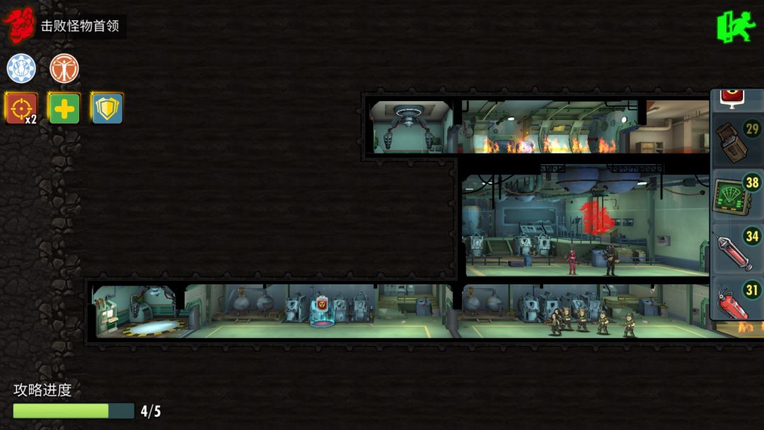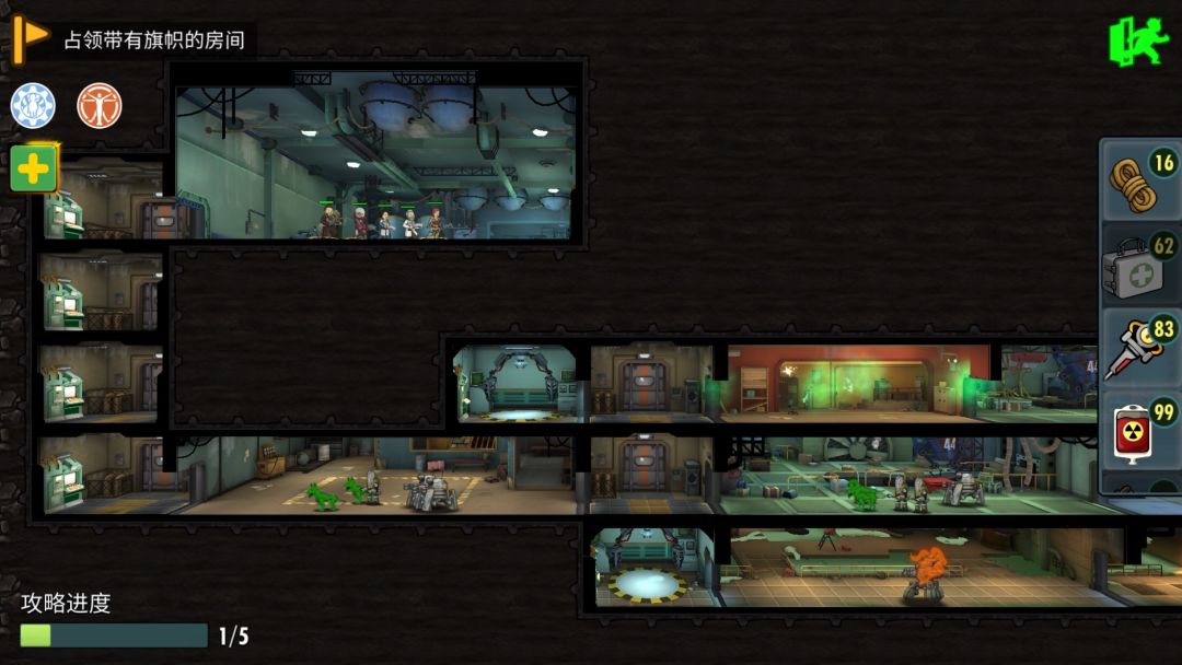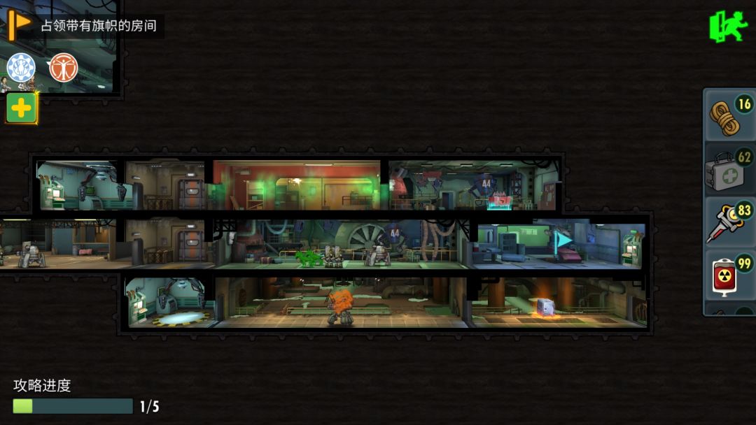 第五层,直接左路boss,推荐阵容(凯特、圣父、李医生、两输出,没有圣父可以换成凯德)。没有圣父的情况,开局可以先用胖子炸掉红机器人,boss会用技能打后排血最少的人,建议五万一以上血量,考验治疗量的一个boss。多准备隐身,快崩盘时使用可以救急。boss结束后留下,可以直接走上路干掉小boss开宝箱。如果辐射严重可以走下路打杂兵,吃群体清辐射,走传送开宝箱。很多地方活用绳索可以节省时间,但需要注意,隐藏关需要用到绳索。隐藏关没什么好说的,三箱子一老鼠。本次活动箱子开碎片几率本人估计在百分之五。所以再祝大家多出碎片。