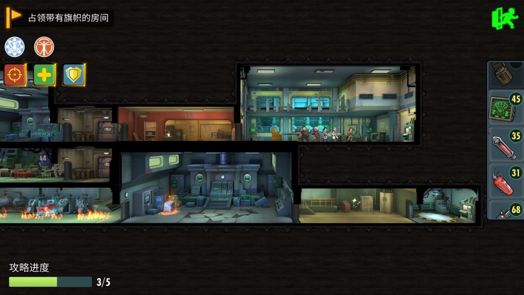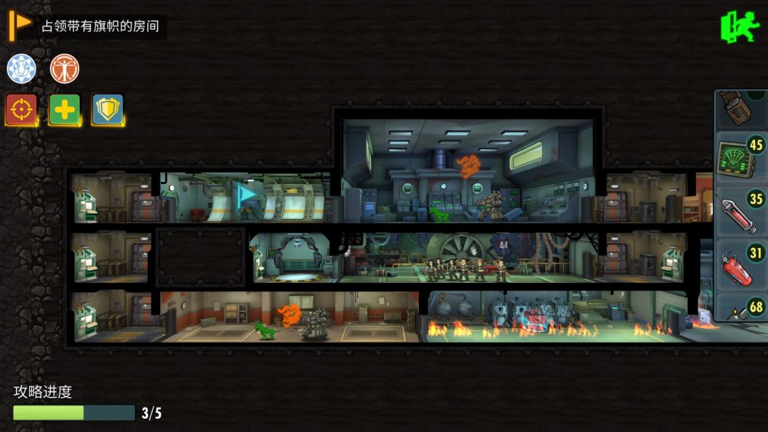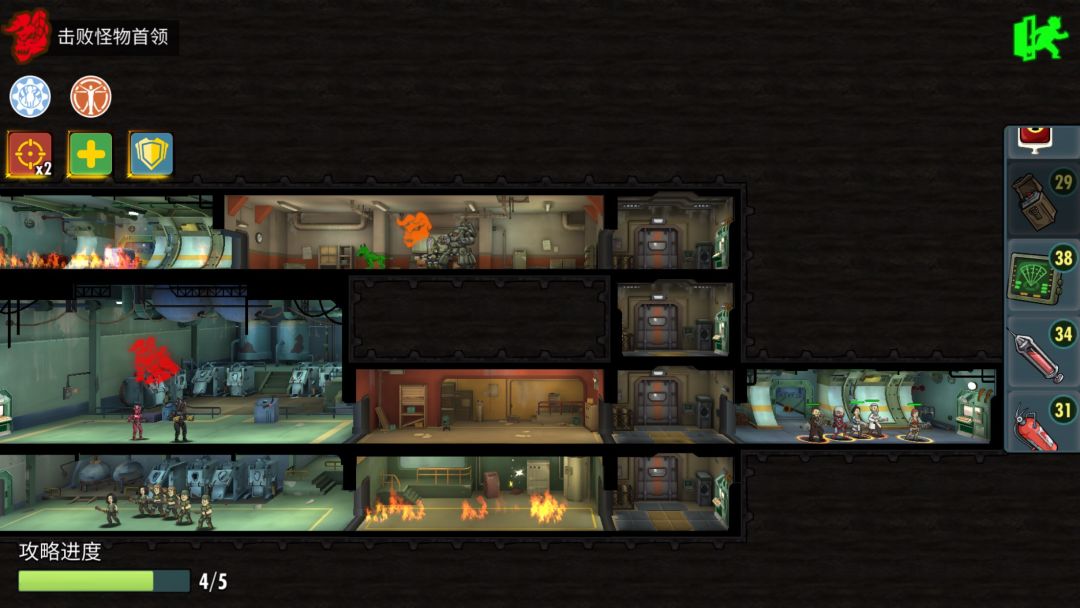第四层,开局顺路干掉boss后直接占领房间。之后留下两条路,一是直接左侧电梯下来后干掉小boss后,拿补给开宝箱过关。二是返回右侧电梯打杂兵,传送后开宝箱,拿补给。根据自己阵容看走那边省事。