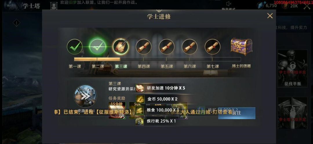 各位领主如果提升学士塔的科技等级,不仅可以获得紧急委托的积分,还能用来提升学士进修的等级,可以说是一举两得。只要在学士塔三大基础内容的等级有一些提升之后,学士进修的第一课以及第二课就能顺便完成了,完成第二课后就能获得研发加速10分钟x5,这样就能进一步加速研发的完成时间,那么紧急委托完成的难度就会更小一些。