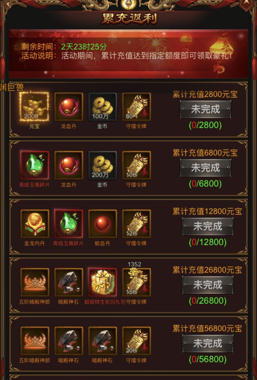 活动内容:活动期间,累计充值达到指定额度即可领取豪礼。