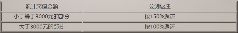 2、在公测时,将根据玩家在所有删档测试中充值的累加金额(即每次删档测试充值的金额加总),并按照上述公测返还规则进行返还。