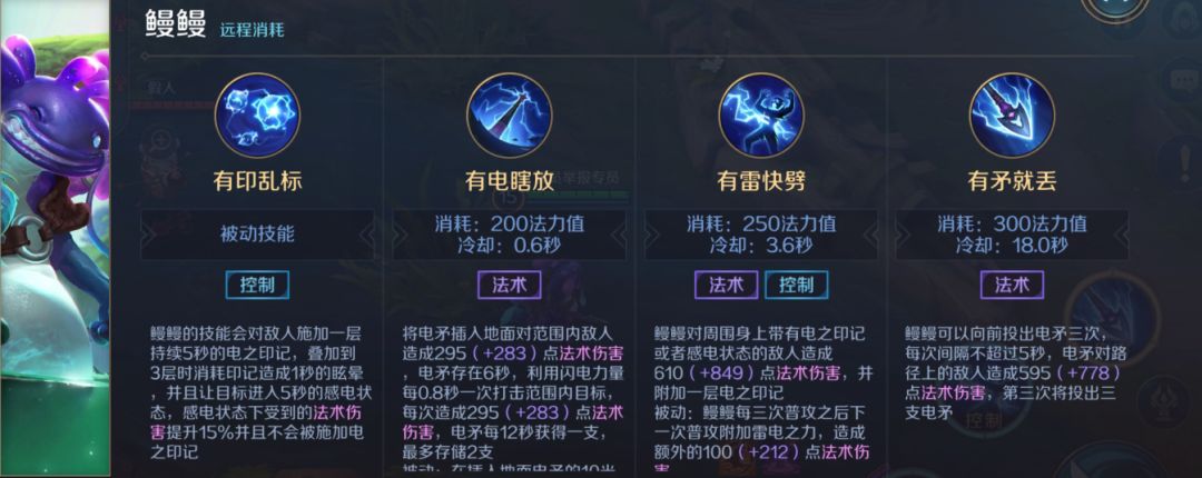 被动:鳗鳗每三次普攻之后下一次普攻附加雷电之力,造成额外的50(+15.0%法攻加成)点法术伤害。