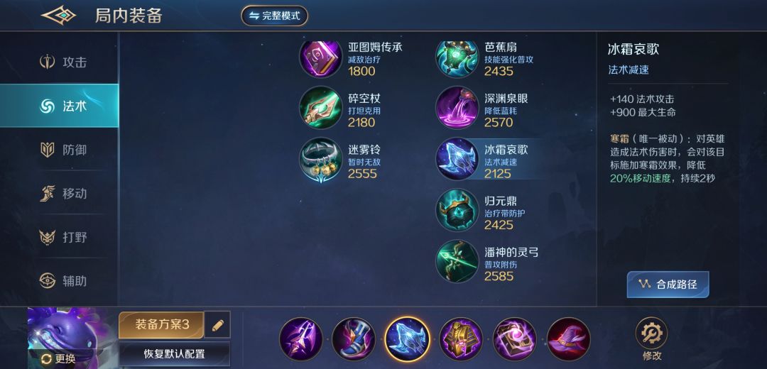 出装我建议出这套,法老的审判+冰霜哀歌可以造成5秒减速效果,其他装备提供法术爆发和吸血。有了这套装备你只需要减速敌人,然后乱标、瞎放、快劈、有矛就丢,敌方会在减速中被你轻松控制秒杀!