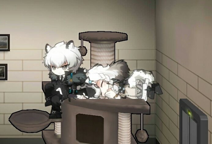 这个指的是三幻神之一的银灰银老板。当你把他放到宿舍的时候,他会爬上“小型游乐架”这个家具。