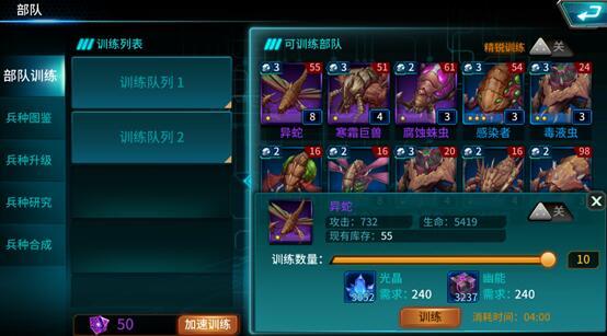 通过主基地界面的部队训练按钮,可进入部队训练界面,当前拥有的兵种可以通过消耗光晶与幽能资源训练部队,增加当前兵种的数量。