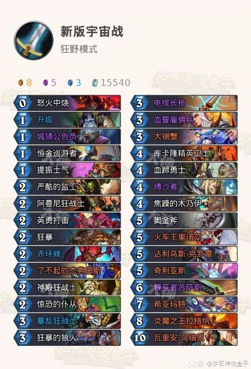 这里Box君还要给大家推荐一套新版本会比较强势的卡组,宇宙战。我们刚刚看到战士虽然防战的体系得不到太多收益,但是瓦王和很多中立牌放在宇宙战就非常合适了,我们来看看构筑: