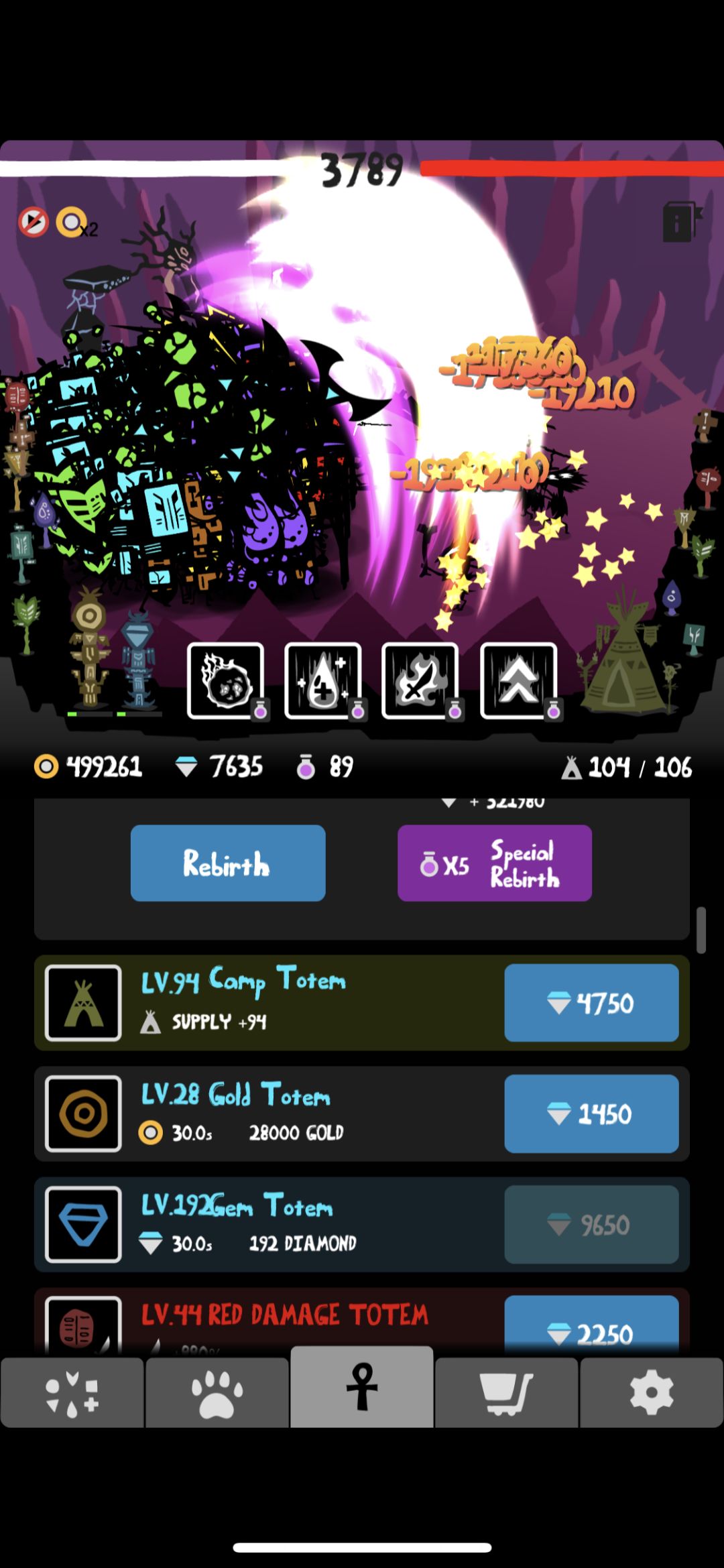 IOS区正版号。手贱买了30元的去广告,后面发现没什么用,钻石主要靠前期的重生和后期升上去的每30秒获得钻石,如图已升到每30秒191钻,因为升完每秒砸石头,眩晕对方全体,过图已经无压力,后期还在升这个每秒获钻,想看最高能到多少。