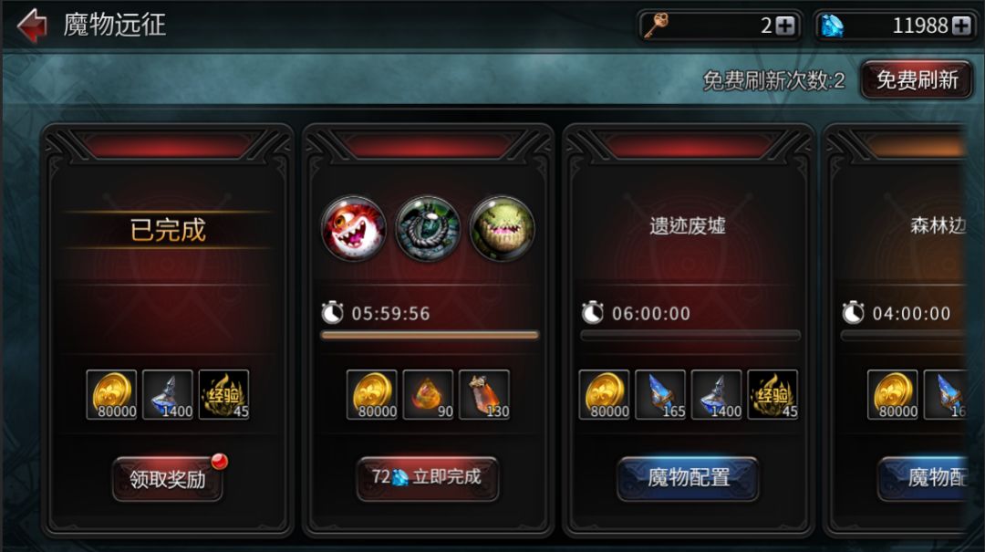猎魔者将激活的魔物派遣远征,将获取丰厚奖励。远征条件为多个,达到的条件越多,可获取的奖励越丰厚。
