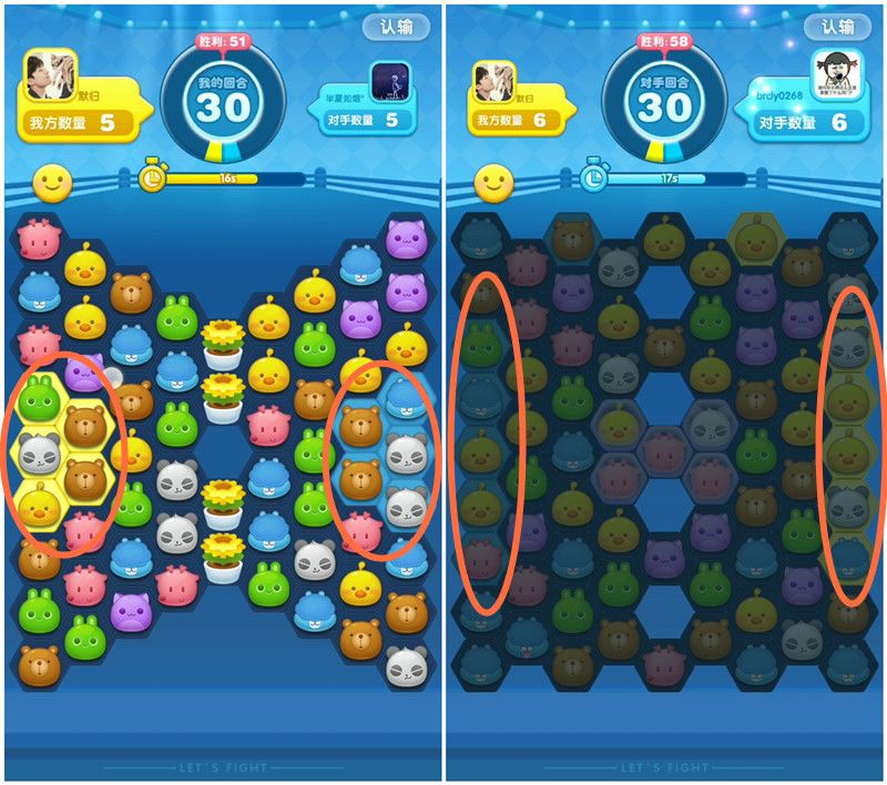 由于对战双方每人每回合有20秒的思考时间,所以看到棋盘后不要着急消除,应该先观察一下棋盘上有没有可以产生特殊棋子的布局,如果有,先消除这些。运气好的话,你很有可能让对手在本局比赛的一大半时间里干看着你一步一步扩大优势。