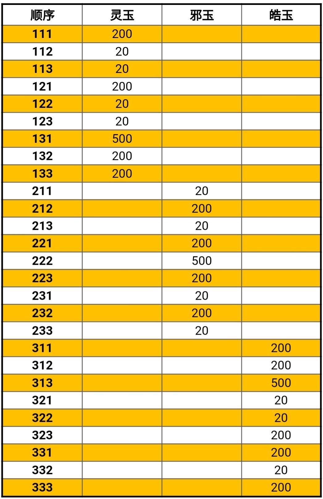 先说结论:131加500灵玉,222加500邪玉,313加500皓玉。