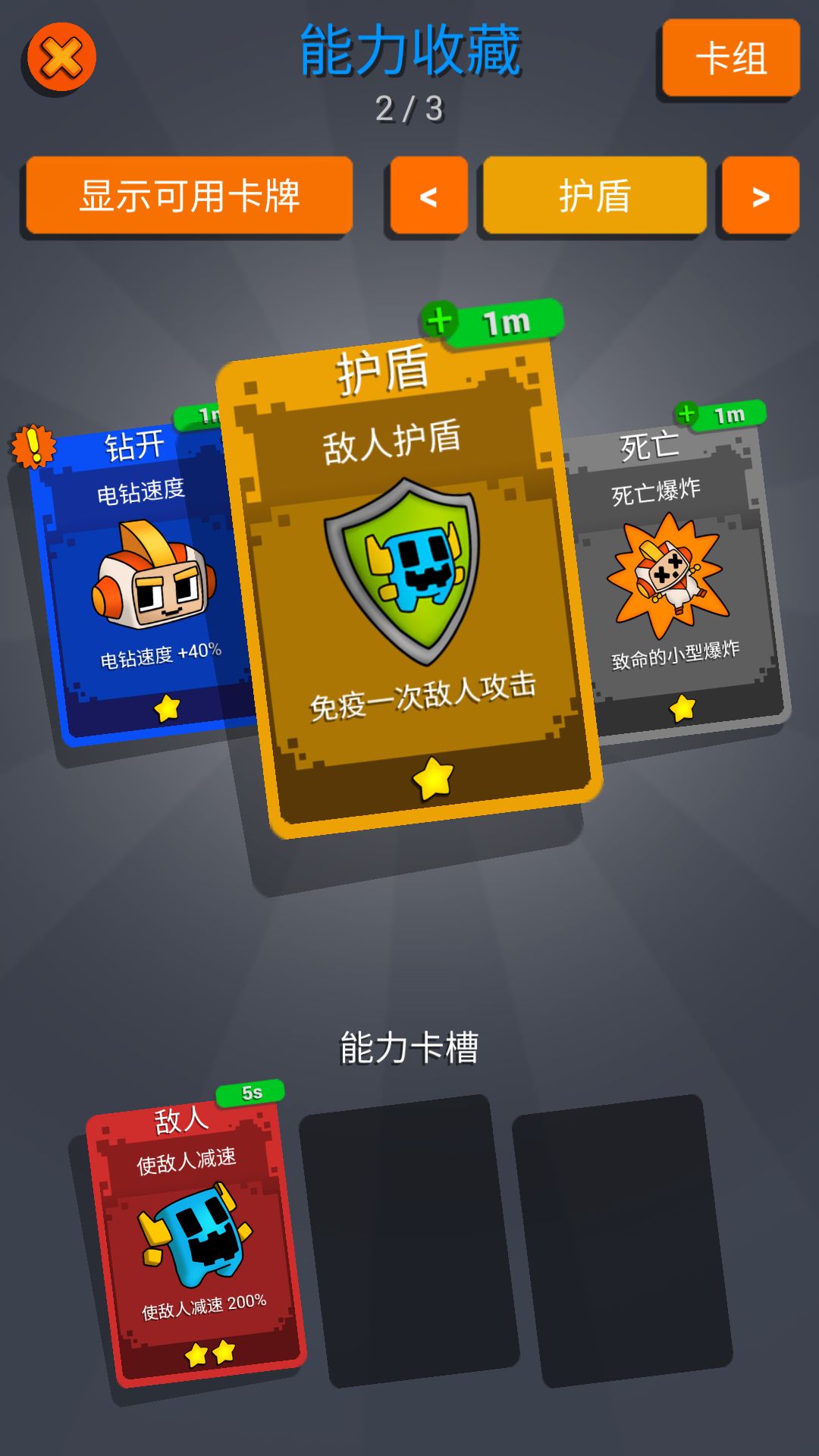 游戏还有一个比较有趣的设定。游戏里并没有传统的「体力」设定,而是每次游戏,都必须装配三张卡片,数目缺一不可,每张卡片都有加成效果。