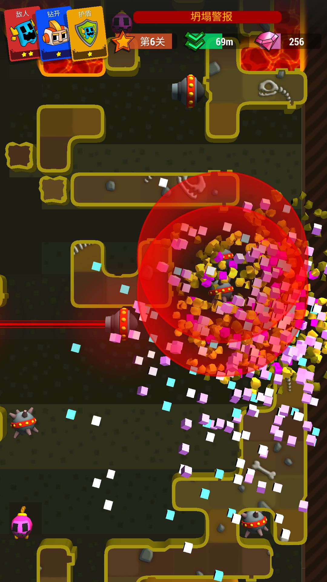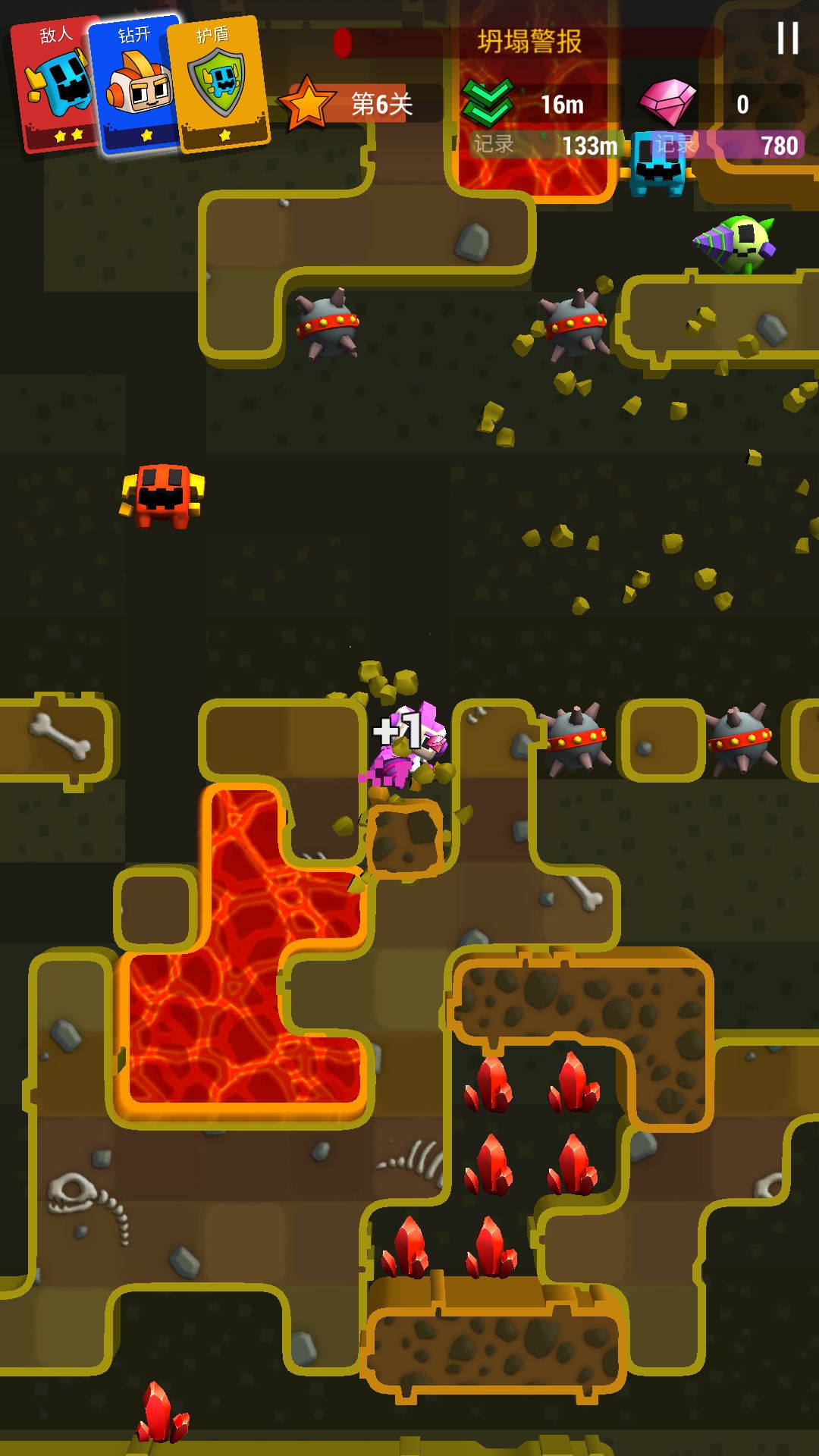 游戏场景中遍布不同质地的土块,含有宝石的土块钻起来需要耗费较长时间。途中会遇到各种坚硬的石块和拦路的敌人,身后还有疯狂追赶的挖掘机。需要快速做出反应,既要尽可能多地挖掘宝石,还要规划路线。